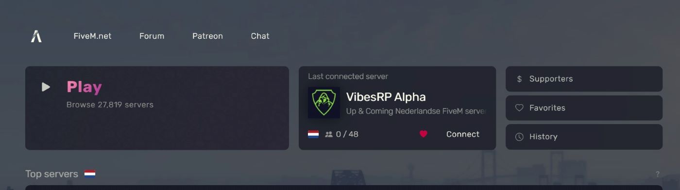 Wanneer je FiveM opstart en klikt op de knop "Play" zie je dat je niet direct kan spelen, maar eerst een server moet kiezen. Er zijn enorm veel servers, met allemaal hun eigen regels. Ook heeft iedere server zelf de keuze welke type scripts of voertuigen ze beschikbaar willen maken voor hun spelers. Dit betekent dat de ene server compleet anders kan spelen dan de ander. Als je een leuke server zoekt, is het handig om eerst met het knopje "Filter" instelt dat je alleen Nederlandse servers wilt zien. Een aantal veelgekozen servers zijn "Maarsseveen Roleplay", "Amersfoort Roleplay", "Royale Roleplay" en uiteraard is VibesRP een hele goede optie.